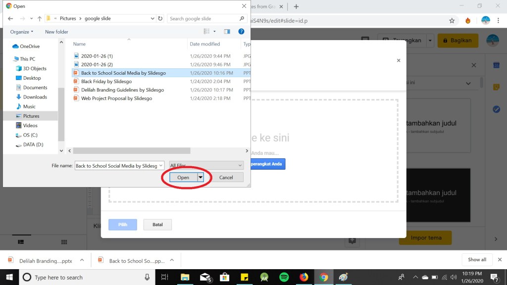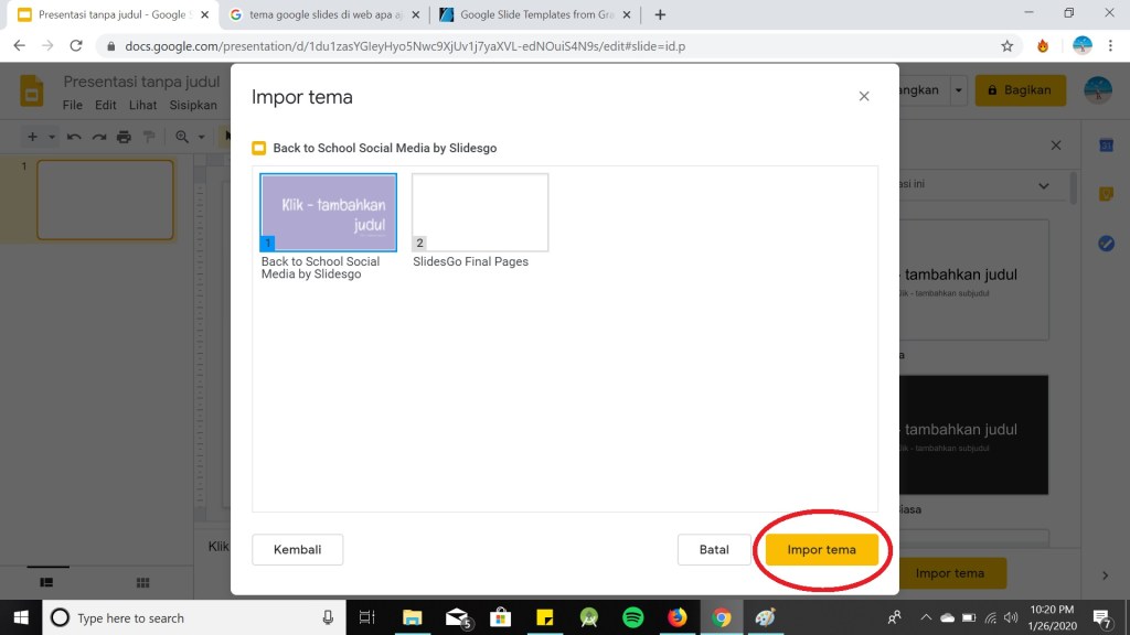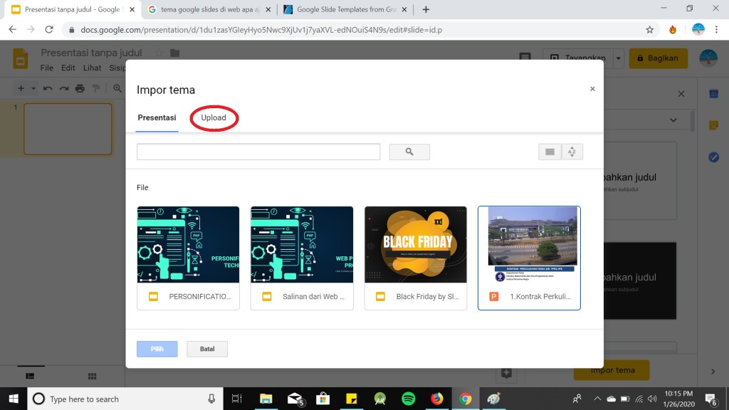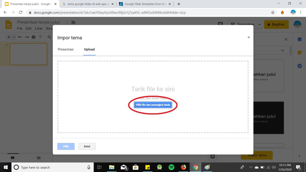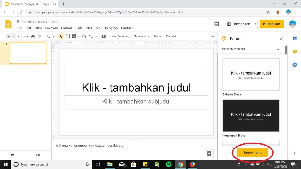 Langkah pertama dalam membuat presentasi baru adalah mengatur bagaimana ia akan terlihat, sehingga lihat kolom berlabel Themes yang muncul ketika membuat presentasi dan pencet Themes. Selain tema yang disediakan dari Google Slide sendiri, Anda dapat mencari tema pada situs web slidesgo, slidescarnival, atau tema yang telah Anda buat sendiri. Tema yang akan digunakan harus di download terlebih dahulu, agar dapat langsung di pencet Upload. Berikut adalah cara menambah Themes :