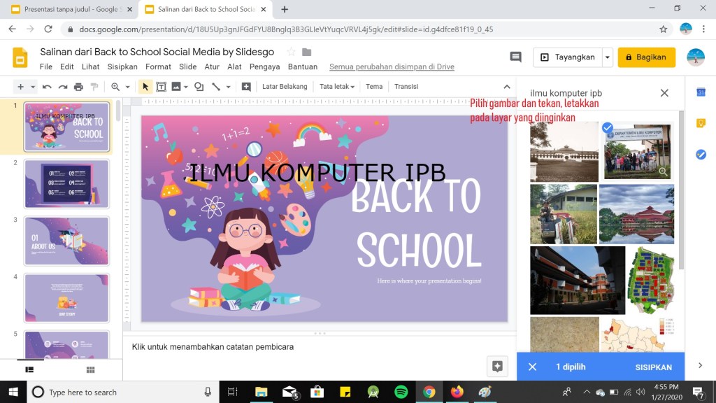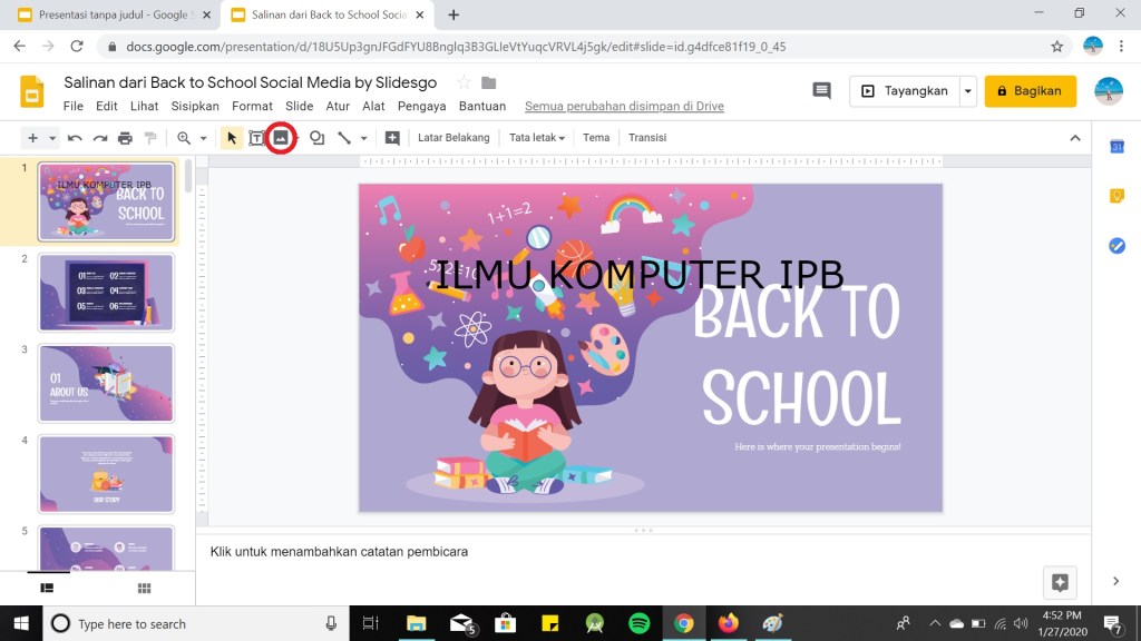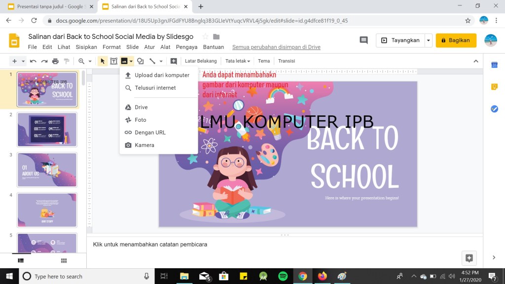 Agar semua orang dapat mengerti apa yang Anda sampaikan, alangkah baiknya Anda memberikan sebuah contoh agar menjadi gambaran seseorang. Berikut cara menambahka gambar pada Google Slide :