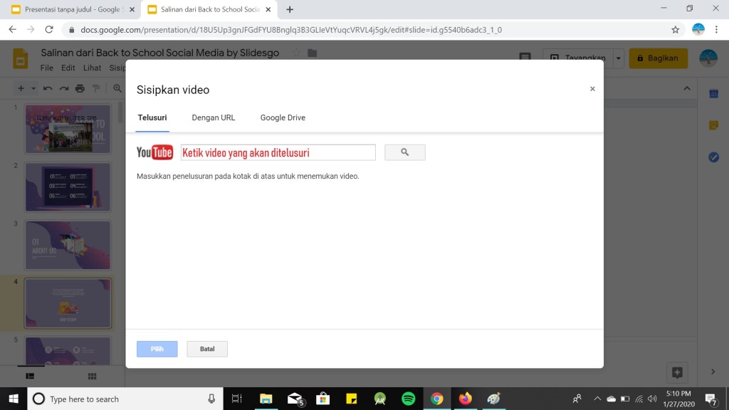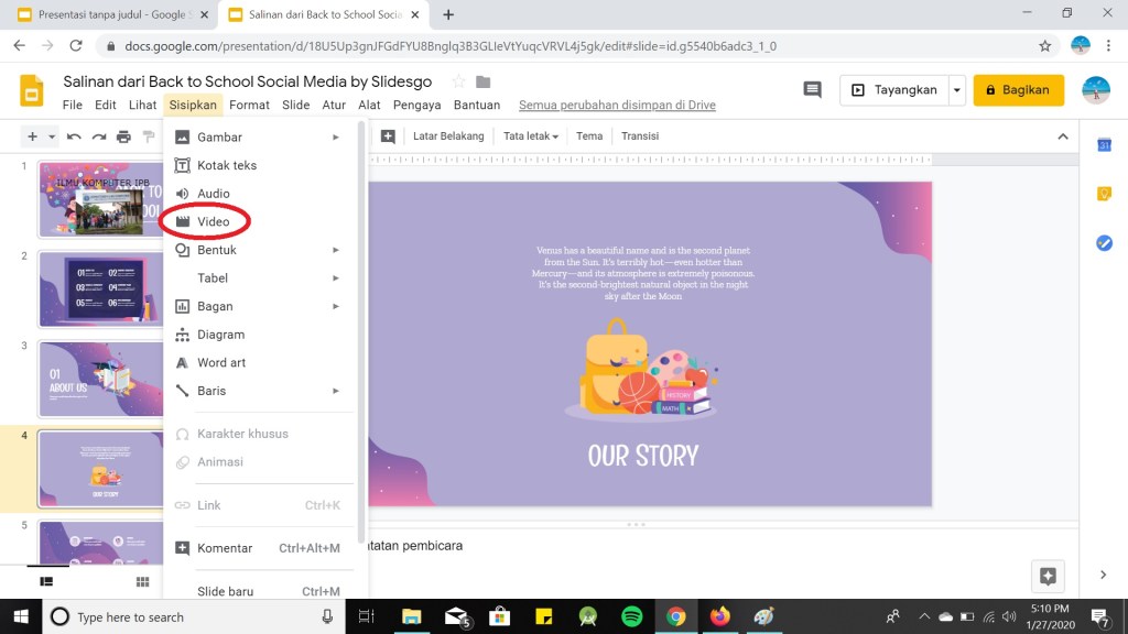 Google Slide juga menyediakan fitur untuk menambah video yang akan membuat presentasimu menjadi lebih gembira dan seru. Berikut adalah langkah-langkah untuk menambahkan video pada Google Slide :