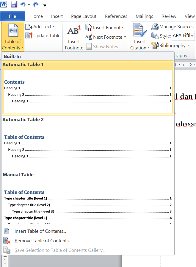 Tekan references >>> table of contents.